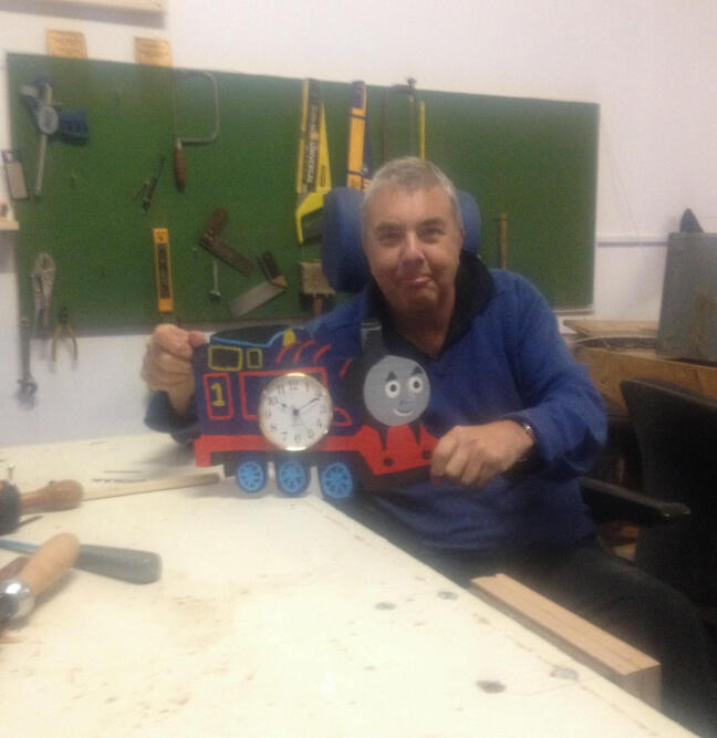 Peter“I am 65 and qualified as a pharmacist. I have been a type 1 diabetic since I was 13. I was diagnosed with primary Progressive Multiple Sclerosis in April 2006. I am a constant wheelchair user as I have lost the use of my legs and have to be hoisted from chair to bed, etc. My upper body still functions fairly well. However due to the diabetes and constant laser treatments on my eyes, I now have no vision to speak of in my left eye and limited vision in my right. I have no peripheral vision. I do feel ‘very hard done to’. I ask myself, “why me, as if the diabetes and all the problems resulting from that aren’t enough?”I have bouts of helplessness and depression. The diabetes I have coped with but find the MS difficult to handle as I’d led a very active life before the diagnosis. I always used to have some sort of ‘project’ on the go and regularly played golf.I look forward to going to the shed as it gets me out of the house to do something I enjoy doing. I am made to feel very welcome and I am so grateful for all the help that I receive there and their patience and understanding. I particularly enjoy the banter and I give out my own share too, the camaraderie, the laughter and the discussions that go on there. I really enjoy creating and making things and the ‘me’ time it gives.Over time I have made various planters including two airplane and one train planter. I have made clocks for my family and a jewellery box for my daughter and nesting boxes for neighbours. I feel really good as I always have something on the go and friends inundate me with commissions! I feel really good when I have finished an item.”